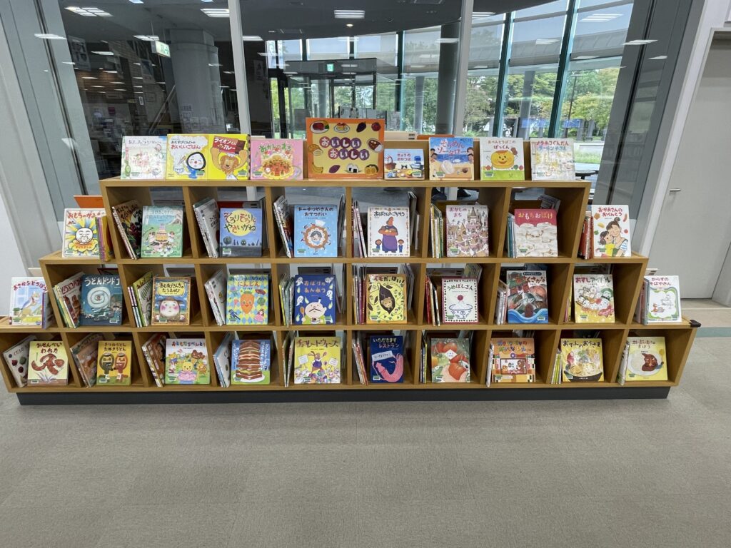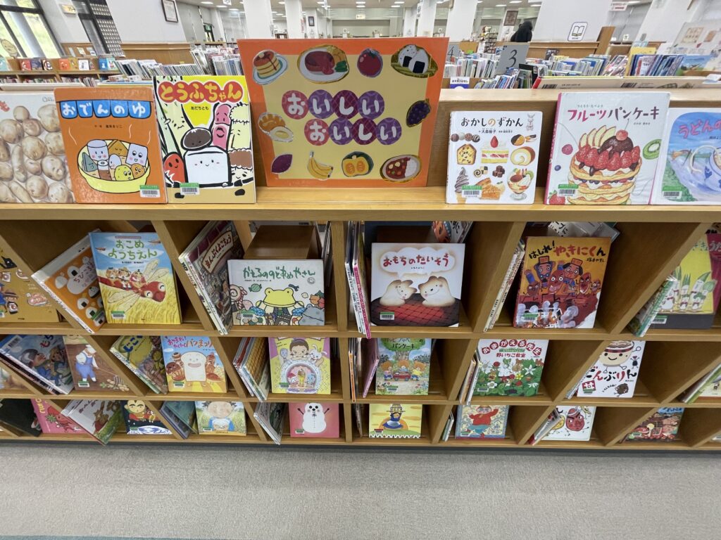 子どもの展示は「おいしい おいしい」です。食欲の秋におすすめの絵本を集めています。